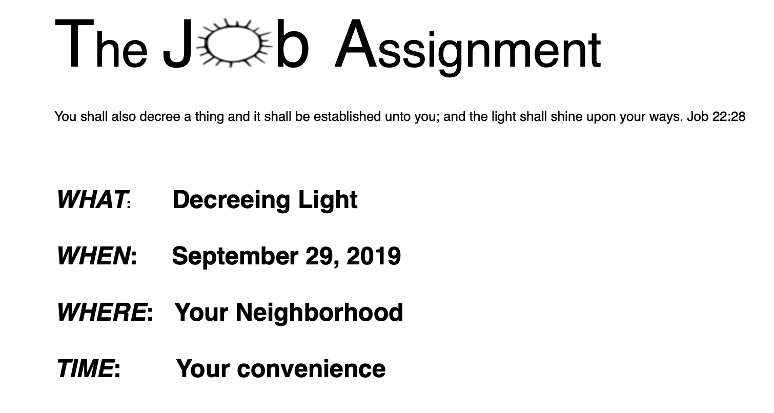 To inform the residents of Allen, Auglaize and Hardin counties of Job 22:28 Assignment scheduled for Sunday September 29, 2019 and to motivate the people of God to release decrees and proclamations while walking up and down their roads, avenues, or streets on this specified day with a unified voice and vision.